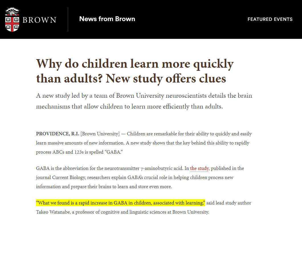 Recentemente os neurocientistas da Brown University descobriram que crianças em idade escolar têm um rápido aumento no GABA (ácido gamma-amino butírico) durante as sessões de aprendizagem tornando-as aprendizes muito eficientes. Em contrapartida, os pesquisadores descobriram que o GABA não aumenta rapidamente em adultos durante ou após as sessões, tornando-os menos eficientes na aprendizagem. Por isso é importante que o estímulo e o ensino sejam o quanto antes.